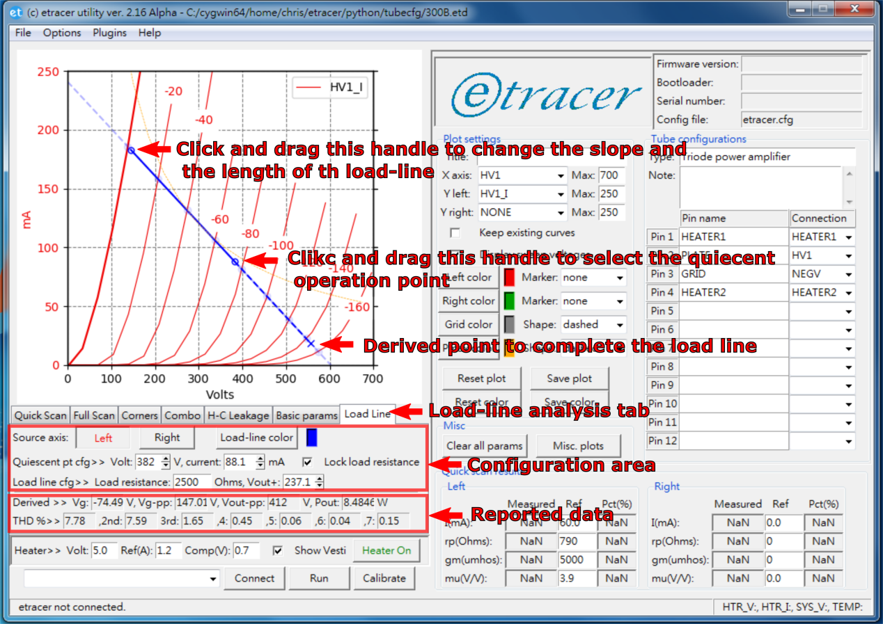 The software calculates and updates the reported parameters on the fly. The reported parameters includes the grid bias, the AC output voltage swing, the output power and a THD (Total Harmonic Distortion) and harmonics report based on FFT (Fast Fourier Transform) up to the 7th order. Below figure is a sample load line analysis for a 300B.