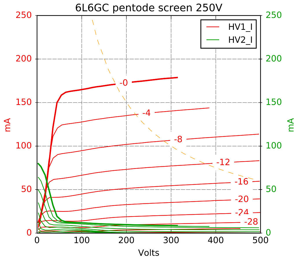 Sample traced curves for a 6L6GC under pentode connection with a screen volt of 250V